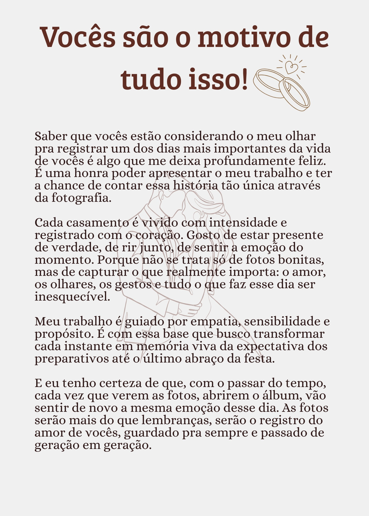 Fotografo casamentos porque acredito que esse dia é um dos capítulos mais bonitos da vida, e ele merece ser lembrado como realmente aconteceu, sem poses forçadas, sem exageros.