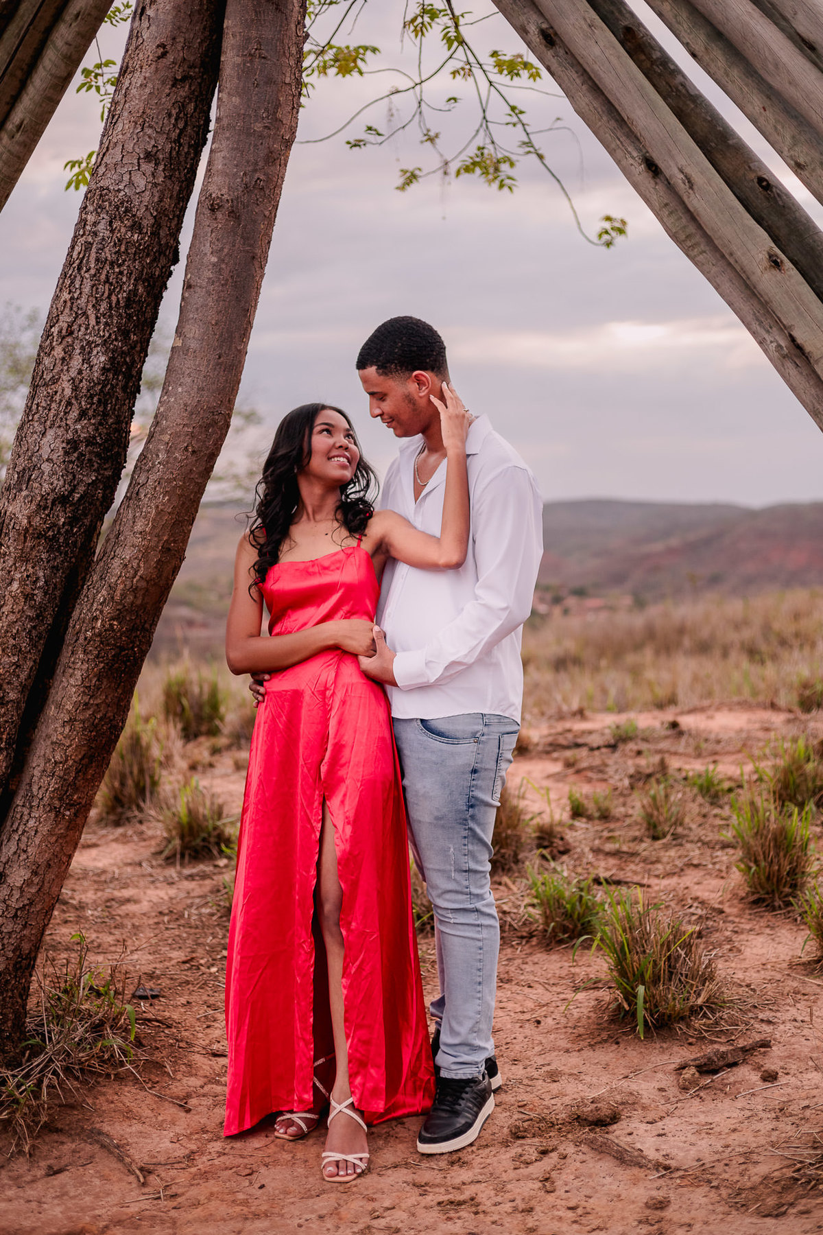 A ideia inicial era fotografar durante o pôr do sol, aproveitando aquela luz dourada que dá um charme especial às imagens. Mas, como a natureza tem vontade própria, fomos surpreendidos por um dia nublado. E sabe de uma coisa? Isso não atrapalhou em nada! Pelo contrário, trouxe um clima diferente e intimista, que combinou perfeitamente com a energia do casal.